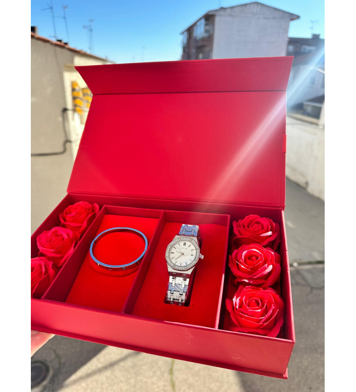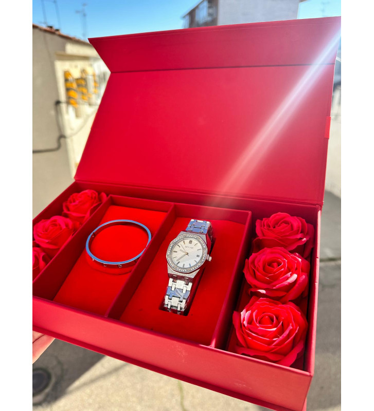 PACK DE RELOJ CON CAJA DE FLORES +RELOJ DE ACERO INOXIDABLE RELOJ INCLUYE PULSERA