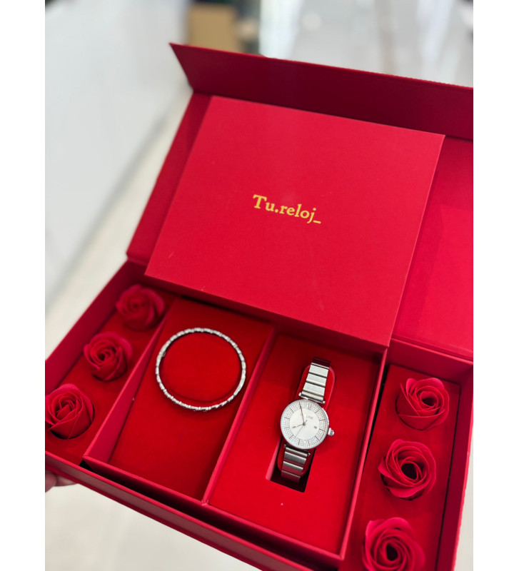 PACK DE RELOJ CON CAJA DE FLORES +RELOJ DE ACERO INOXIDABLE RELOJ INCLUYE PULSERA