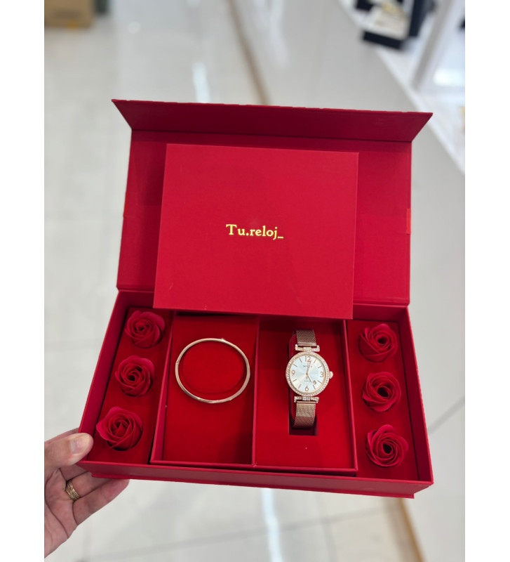PACK DE RELOJ CON CAJA DE FLORES +RELOJ DE ACERO INOXIDABLE RELOJ INCLUYE PULSERA